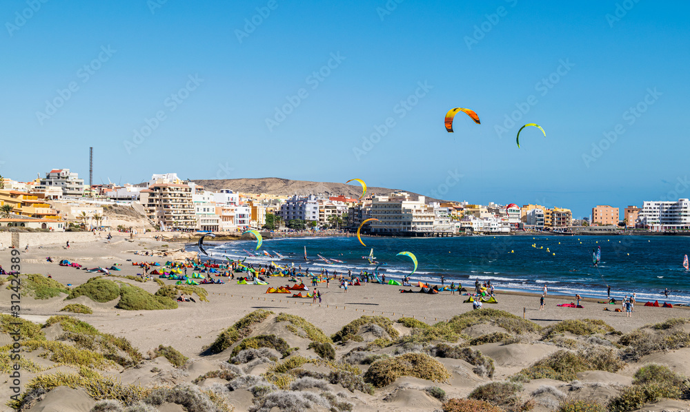 El Médano beach on the Southern Coast of Tenerife with a colorful crowd of kitesurfers.
