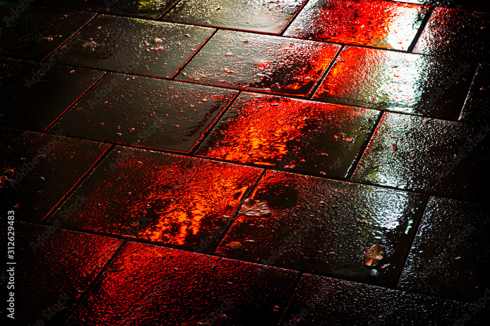 night reflection of light on the wet sidewalk of the city. reflection of red light.