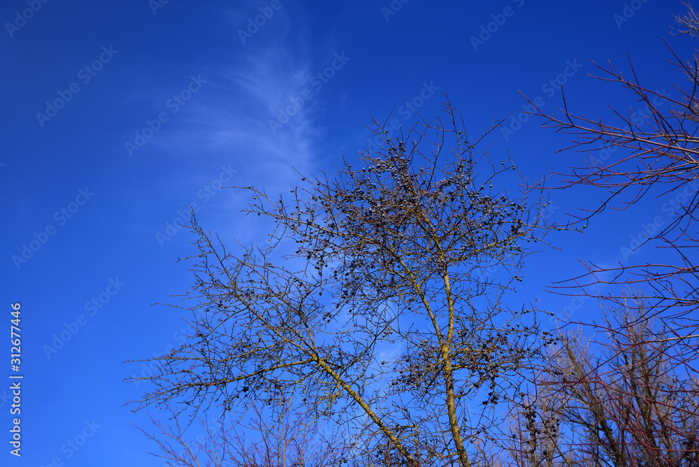 Typical winter vegetation with bare branches and twigs and wild sloes that still hang blue on the branches, against a blue sky with sunshine in Germany