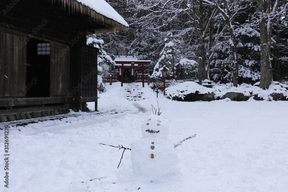日本の冬 南会津 湯西川平家の里 古民家の雪景色 雪だるま