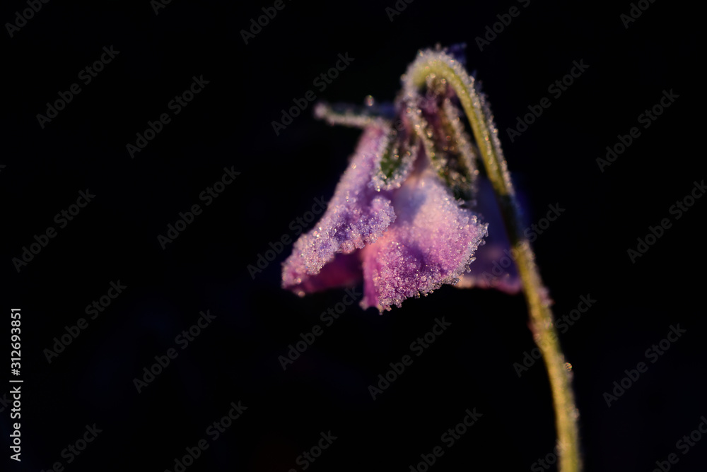 Close-up of a frozen, faded pansy with ice crystals against dark background with text field in winter