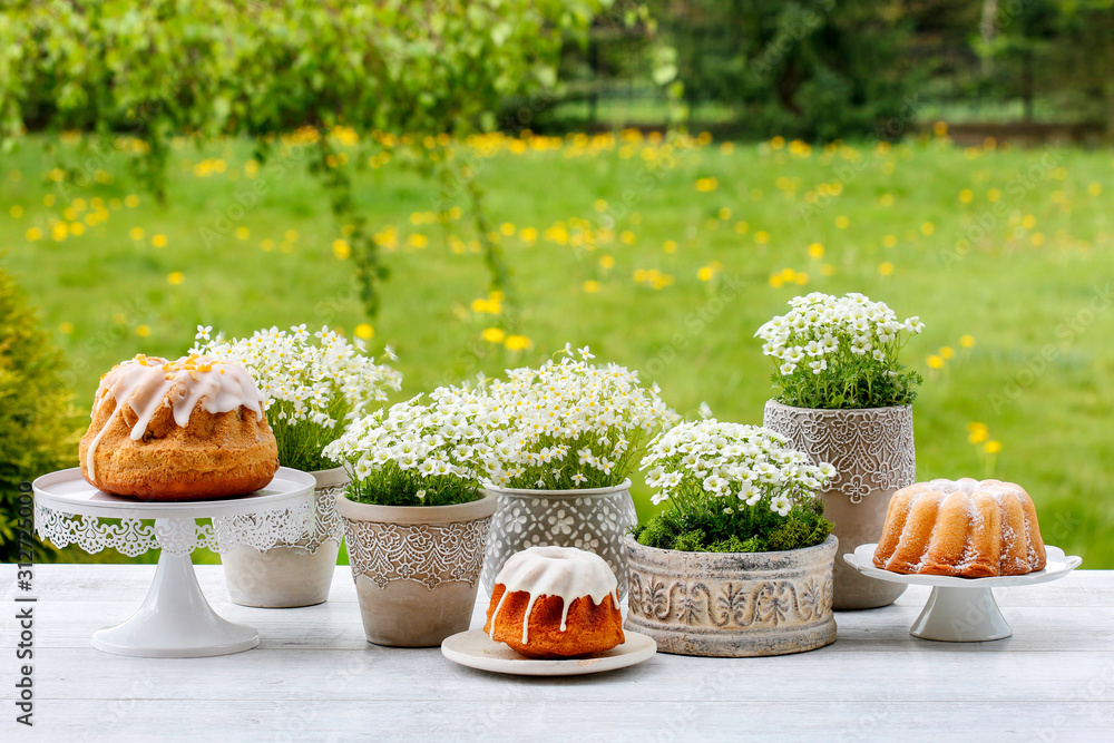 Traditional Easter cakes, beautiful spring flowers and handmade decoration
