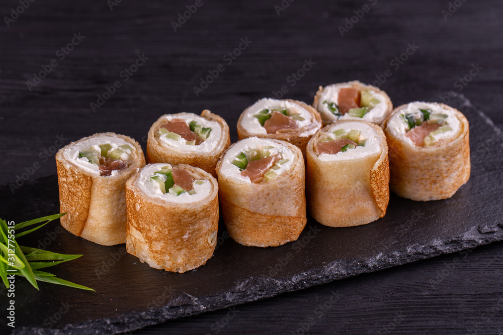 Rolls of pancakes with fish filling with greens