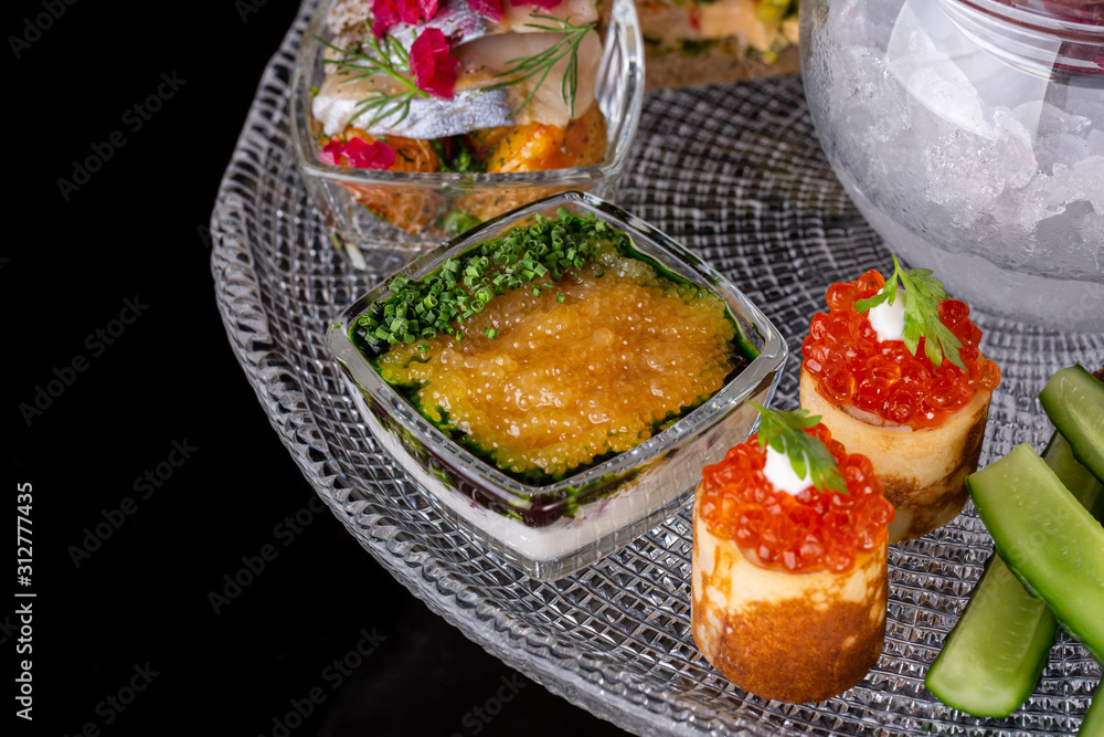 Pike caviar in glassware with greens and butter, pancakes with caviar