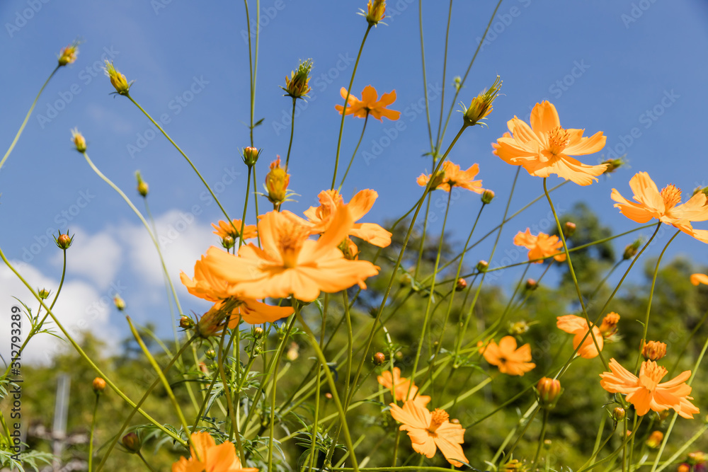 Yellow Cosmos Flower field with blue sky,Cosmos Flower field blooming spring flowers season
