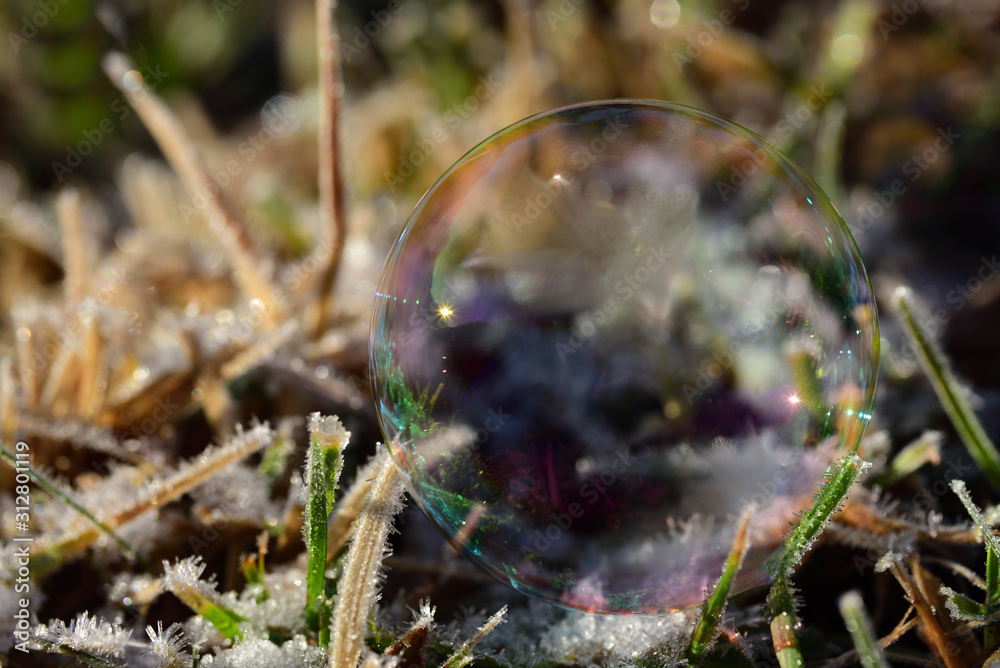 Close-up of an iridescent soap bubble in winter reflecting on frozen blades of grass in sunlight