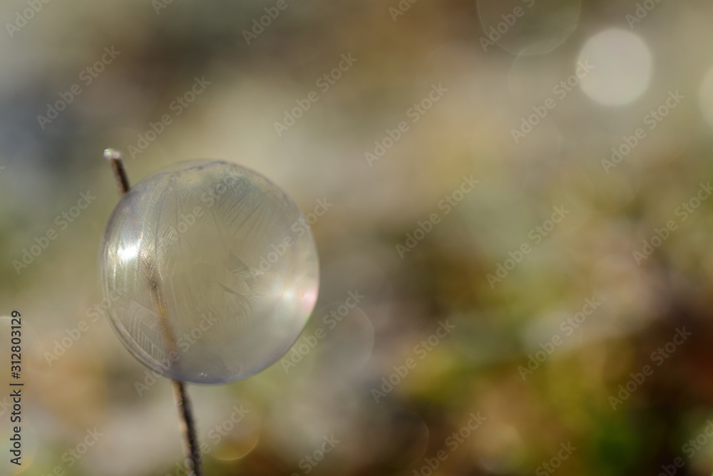 Background with a romantic frozen soap bubble in bright sunlight, on which the light rays are reflected with space for text