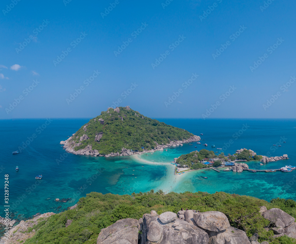 Aerial drone view of beautiful Koh Nang Yuan island in Thailand