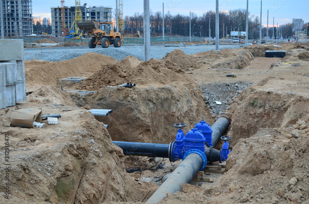 Construction of main water supply pipeline. Laying underground storm sewers at construction site, water main, sanitary sewer, drain systems. Installation of the gate valves for city groundwater system