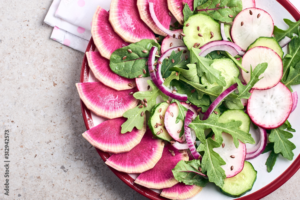 Salad with radish, cucumber, red onion and arugula.