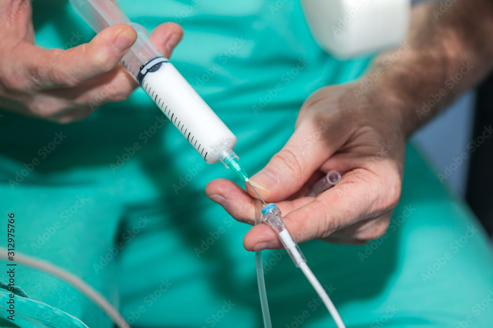 Surgical team preparing their patient for surgery, anesthesiologist gives anesthesia to a patient