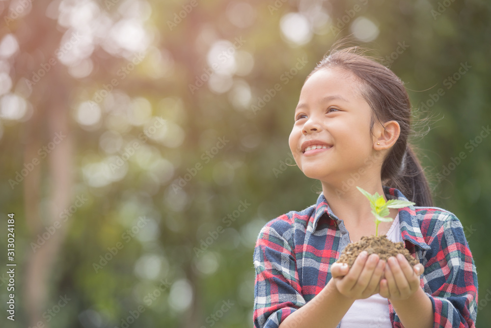Kid holding young plant in hands against spring green background. environment earth day In the hands of trees growing seedlings. concept ecology