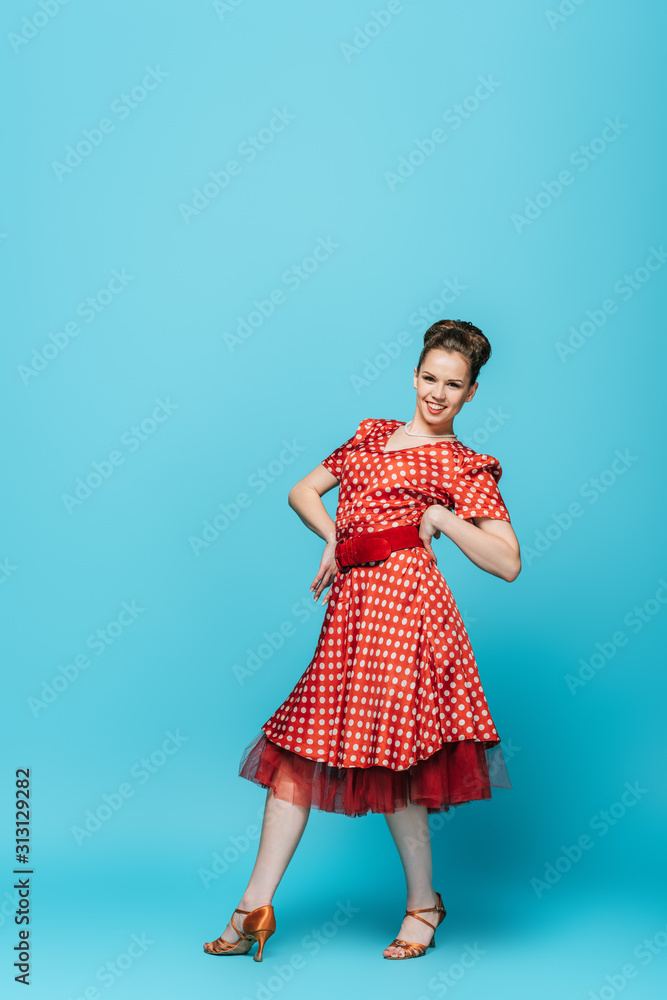 cheerful, elegant dancer looking at camera while dancing boogie-woogie on blue background