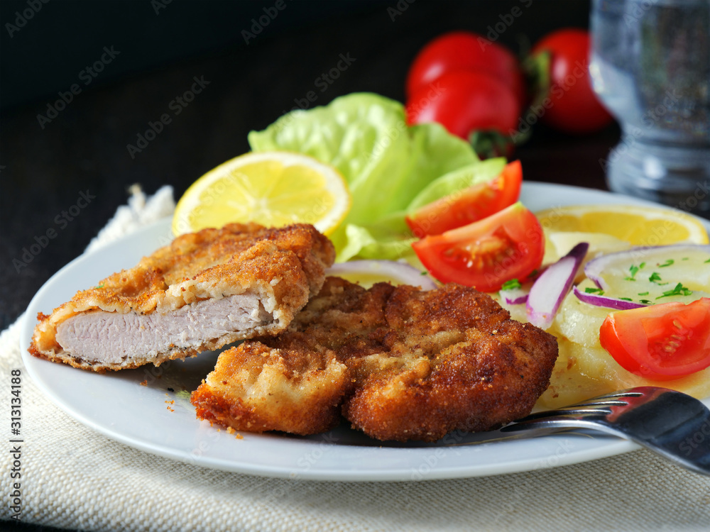 Wiener Schnitzel with potato salad served with lemon slices and parsley leaves