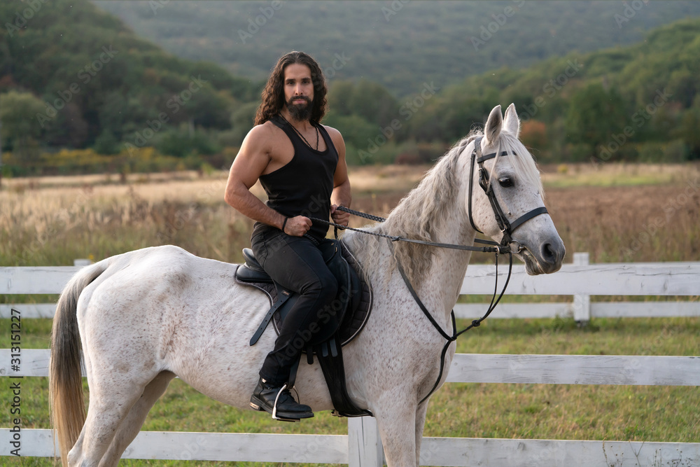 Beautiful horse with man rider trotting on autumnal field. Equestrian and animal love concept. Rider on gray arabian horse in the field. Handsome bearded man riding horse at farm.