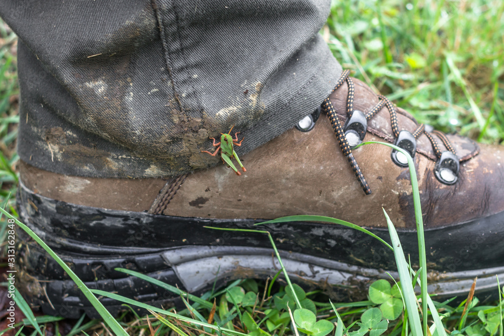 Green grasshopper on a trouser leg. Insects in the forest. Communication with the wild. Trekking in Europe. Insect on pants and shoes. The life of a tourist. Trekking boots.