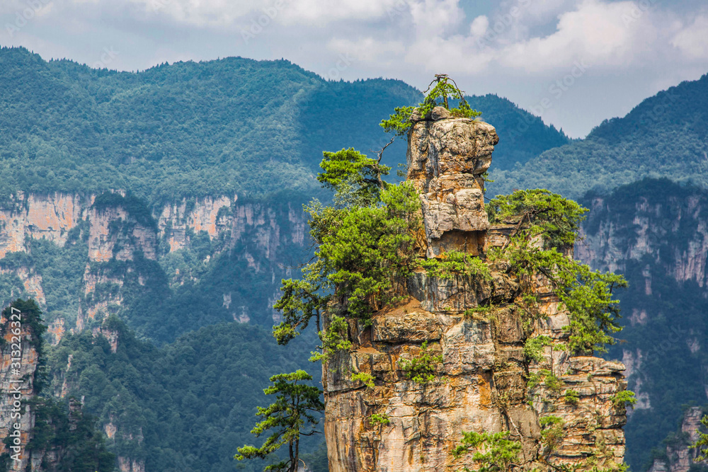 Amazing view of natural quartz sandstone pillar the Avatar Hallelujah Mountain among green woods and rocks in the Tianzi Mountains, the Zhangjiajie National Forest Park, Hunan Province, China.