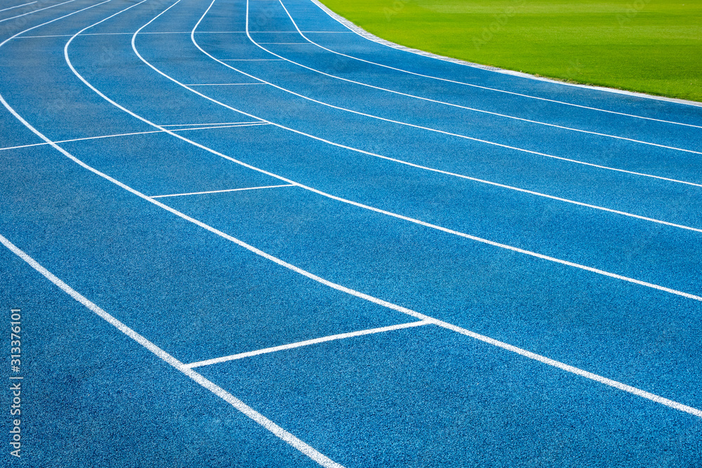 Blue running treadmill track with lane numbers in stadium outdoors.Starting grid of race track at the stadium
