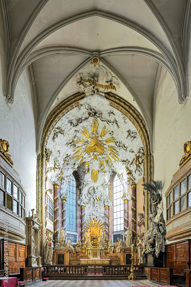 Choir and altar of Saint Michael's Church in Vienna, Austria. The high altar, designed in 1782 by Jean-Baptiste d’Avrange, is decorated with sculpture Fall of the Angels by Karl Georg Merville.