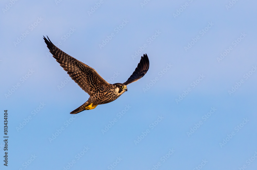 Peregrine falcon (Falco peregrinus) juvenile flying in blue sky, Galveston, Texas, USA.