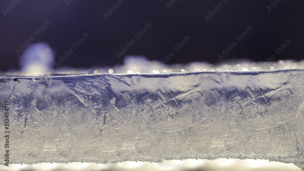 Closeup of frozen ice glistening in the sun outdoors in winter against blue background