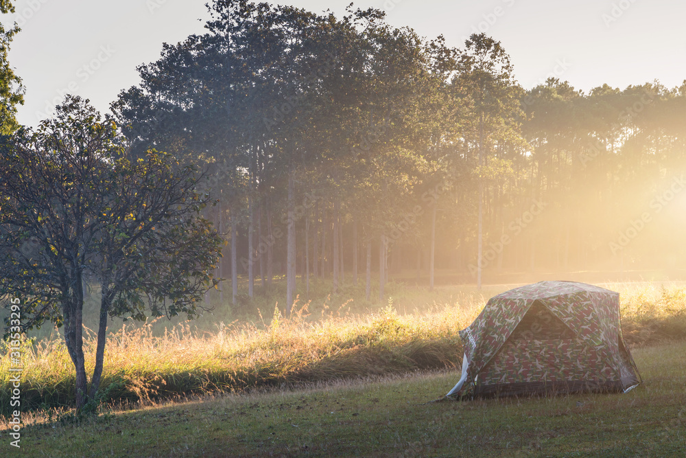 Camping tent on green field near forest during dramatic sunrise at summer misty morning,Concept of outdoor camping adventure