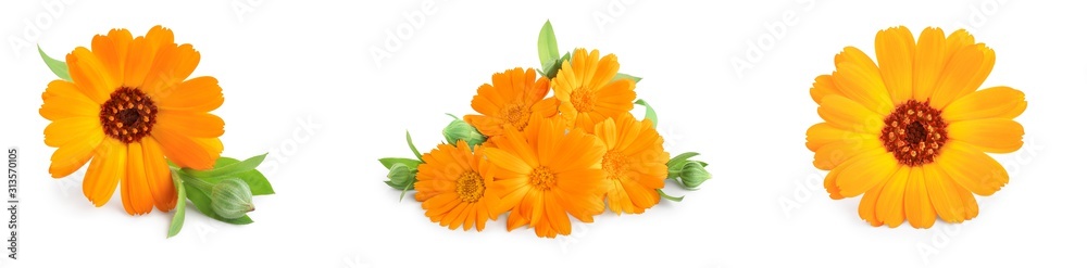 Calendula. Marigold flower with leaves isolated on white background. Set or collection