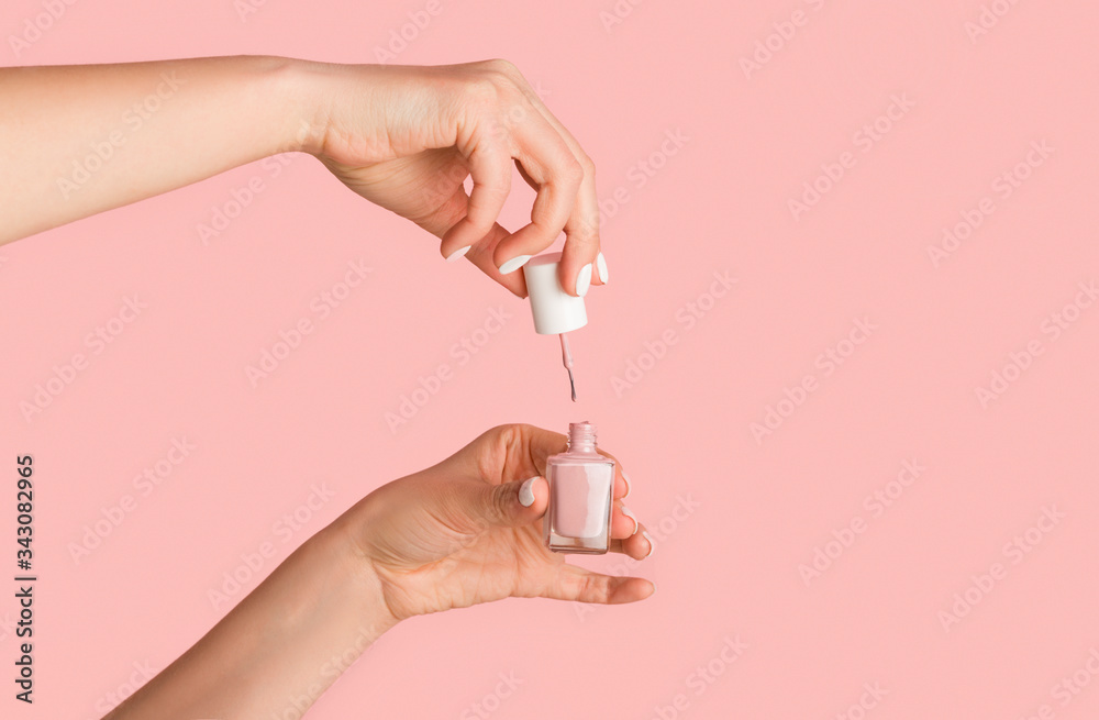 Manicure nail paint with thin brush on colour background,Nails artist polish, modelation gel