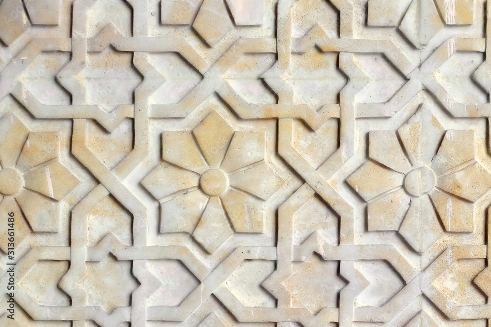 Background of flowers Arabic style, close up. Texture with African pattern on the stone wall. The texture on the concrete surface is orange.