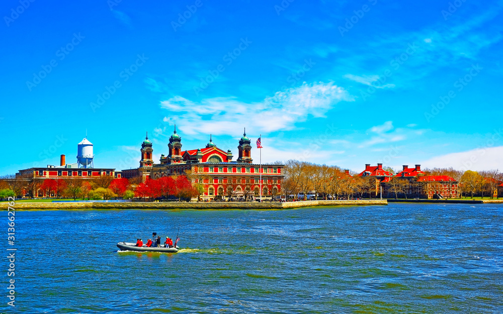 Ellis Island in Upper New York Bay. It was a gateway for immigrants. Manhattan area, New York City, America USA. American architecture building. Metropolis NYC. Cityscape. Hudson, East River