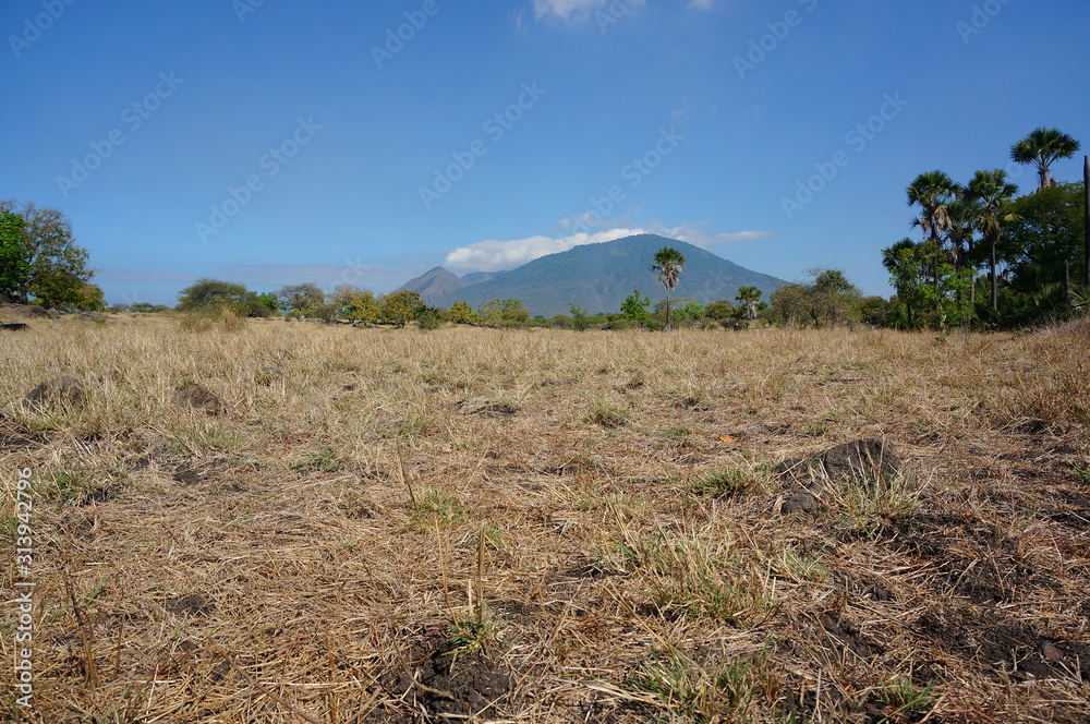 The expanse of the savanna is dominated by dry grass and several trees that spread widely against the background of mountains and canyons.