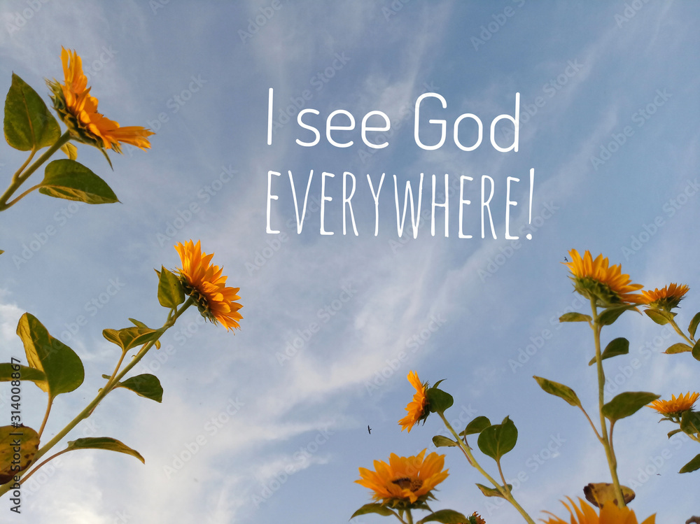 Inspirational quote - I see God everywhere. With beautiful frame of sunflowers background on white clouds and bright blue sky in low angle view.