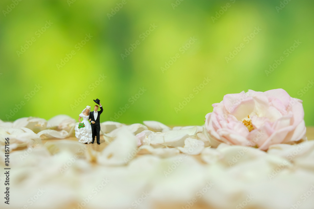 Miniature photography - outdoor wedding / garden wedding ceremony concept, bride and groom walking on white rose flower pile