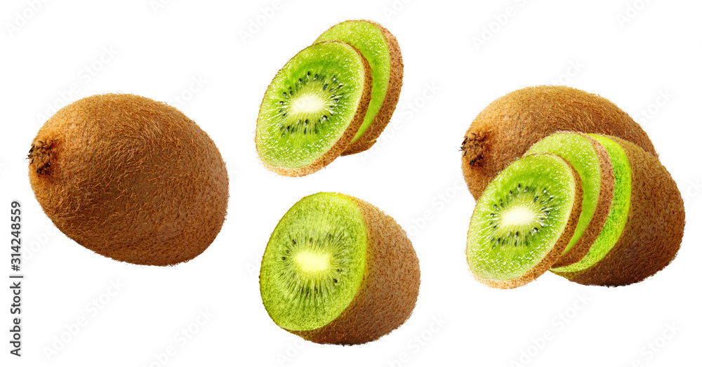 Fresh ripe kiwi fruit, whole, half cut, kiwi slices fruits set isolated. Kiwi design elements, studio shot focus stacking, white background. Raw tropical kiwi fruits, healthy diet nutrition clipart