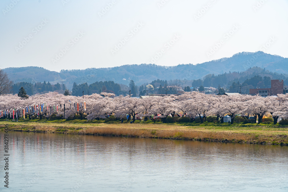 Tenshochi Park along the Kitakami River in springtime sunny day morning. Rural scene with beauty full bloom pink sakura flowers. Kitakami, Iwate Prefecture, Japan