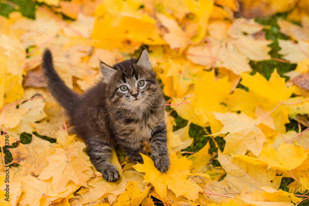 cute brown kitten sitting playing with orange and yellow maple leaves on green grass in autumn