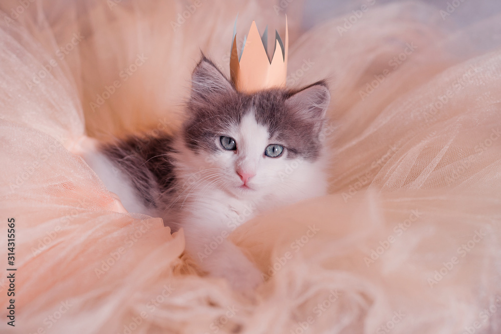 cute gray kitten in the image of a princess in a crown and a full skirt