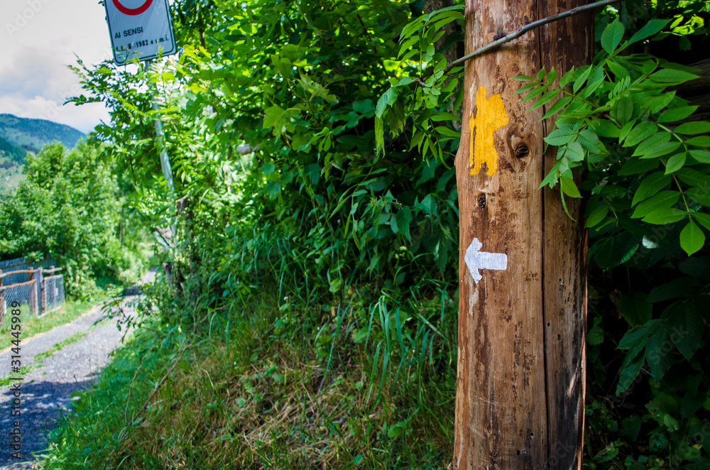 Una frecci e il simbolo del pellegrino indicano la direzione della Via Francigena nell'alta Val di Susa
