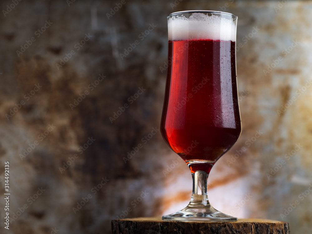 A glass of red ale on a dark metal background
