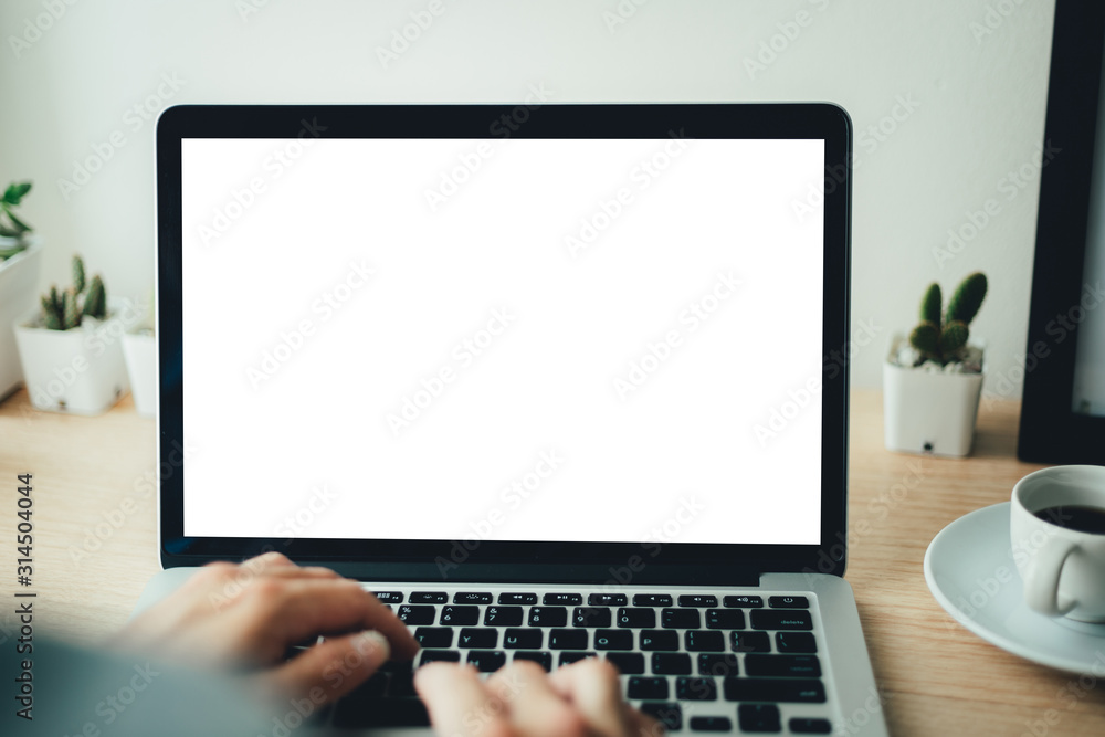 mockup image blank screen computer with white background for advertising text,hand man using laptop contact business search information on desk at coffee shop.marketing and creative design