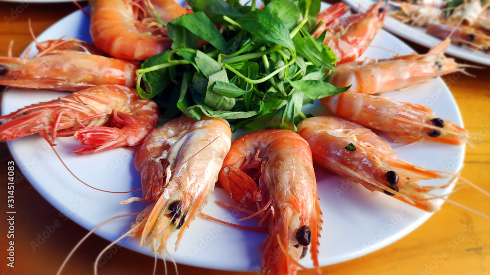 Big red shrimps Delicious king prawn boiled with head and sweet chillies sauce green vegetable herbs on white plate Asian cuisine Thai traditional food healthy fresh seafood