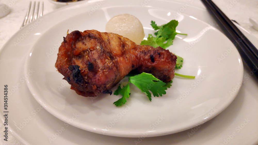 Delicious chicken drumstick deep fried marinated meat with scallop chili sauce vegetable coriander decoration on white plate delicious asian cuisine food wedding party