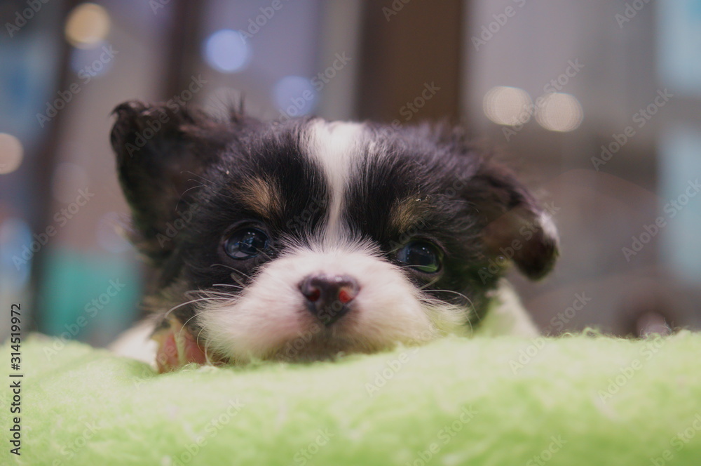Sleepy puppy in a cage