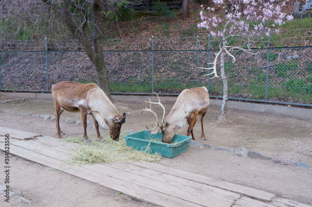 Reindeer meal time in the zoo