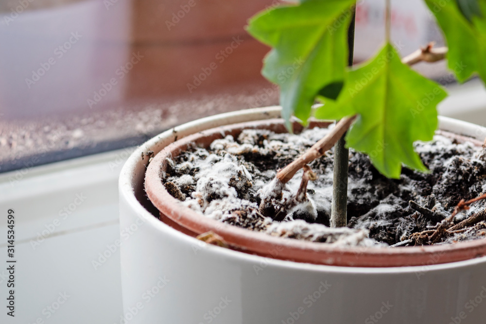 Mould growing on a soil in the flower pot with the house plant. Young ivy plant in humid environment. Fungus disease in cissus houseplant.
