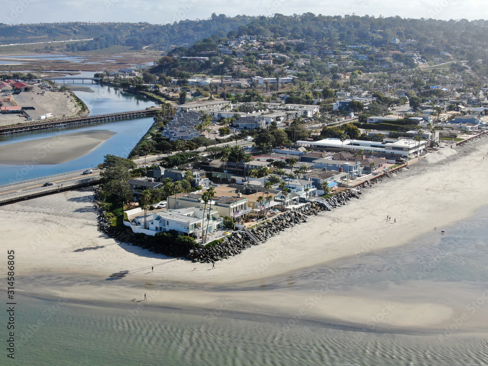 Aerial view of Del Mar North Beach, California coastal cliffs and House with blue Pacific ocean. San Diego County, California, USA
