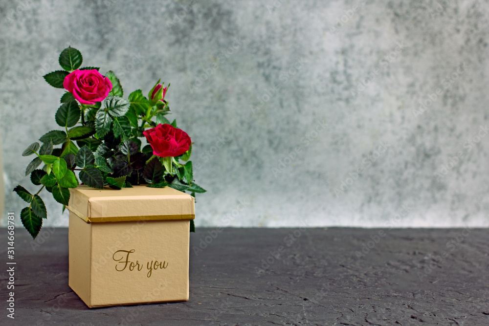 Gift box and red roses on a dark background. Congratulatory postcard to the day of St. Valentine, birthday, mother's day. Copy space