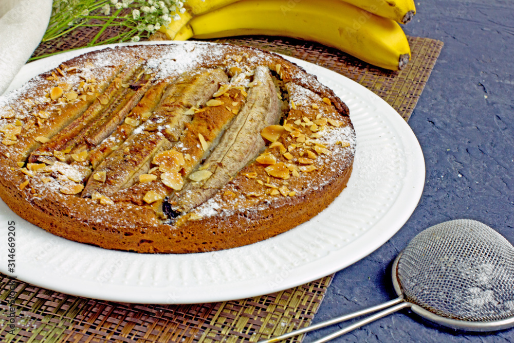 Banana cake made from almond flour and banana on a white plate on a dark background. Gluten free baking concept, dessert without sugar