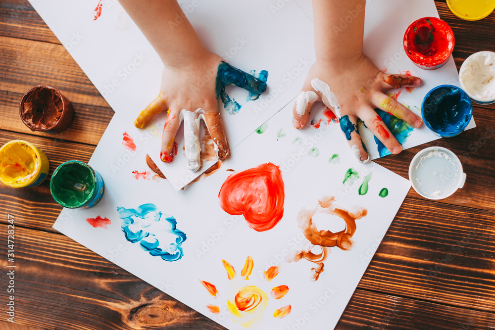 Close-up of child hand painting colorful mosaic. The child is drawing his palms on white sheets with finger paints