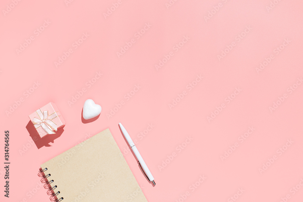 Pale notebook, pink gift boxes and white decorative hearts on pink background. Flat lay composition. Feminine workspace. Romantic, St Valentines Day concept